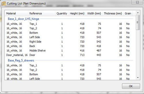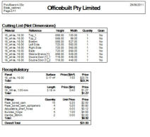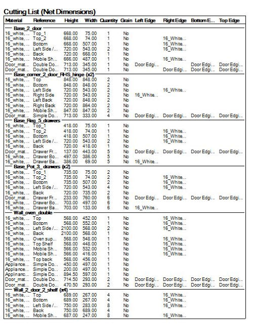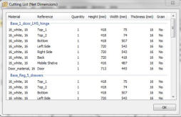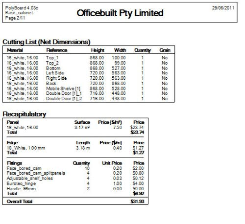 Polyboard can produce a variety of reports and drawings. At the cabinet level 3D drawings can be printed of the cabinet itself as well as detailed part drawings including all dimensions. In addition detailed costings of all materials, including quantities used as well detailed hardware component lists, are all produced automatically.At the Project level detailed reports covering the entire layout is produced including global cut-lists, material and hardware lists with detailed costings. These reports can customised with the ability to turn on and off report data to be included as required and has the ability to personalise by printing the company name at top of each page and extra custom information on the first page.Cutlists are Dynamically generated and can viewed for verification, printed in a report together with edgebanding information and also exported to optimiser or even an excel spreadsheet. (see next section)