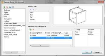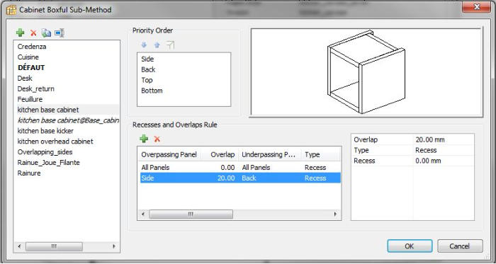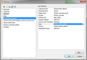 A very useful feature of Polyboard software is the ability to specify manufacturing methods. These are global rules that define how the cabinet is constructed and allow very easy cabinet creation by just selecting a particular an entire manufacturing method or just a particular sub-method.Sub-methods include a method for overall cabinet construction, including all part joints overlaps and recesses.Other sub-methods cover cabinet attributes such as: Materials, Edgebanding, Hardware fittings, Dividing panels, as well as properties of drawers and doors.The result is that a user can choose to create a new cabinet based on their cabinet library or they can easily create it from scratch, using the Manufacturing methods libraries.