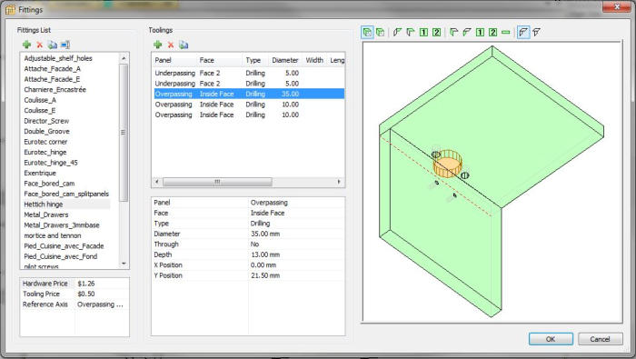 Fully specify all the Boring and grooving machining operations of each hardware fitting that you use.Not limited to any particular brand or hardware type. you specify and control how to machine your cabinets.Easy positioning rules to determine hardware placement. Hardware maintains relations between two parts automatic positioning on cabinet resizing and extra fittings such as hinges and cam can be added automatically on cabinet resize.Hardware fittings can located between to parts as a connector or parametrically on one part only.Easy hardware setup, and view placement in 3D on each cabinet.